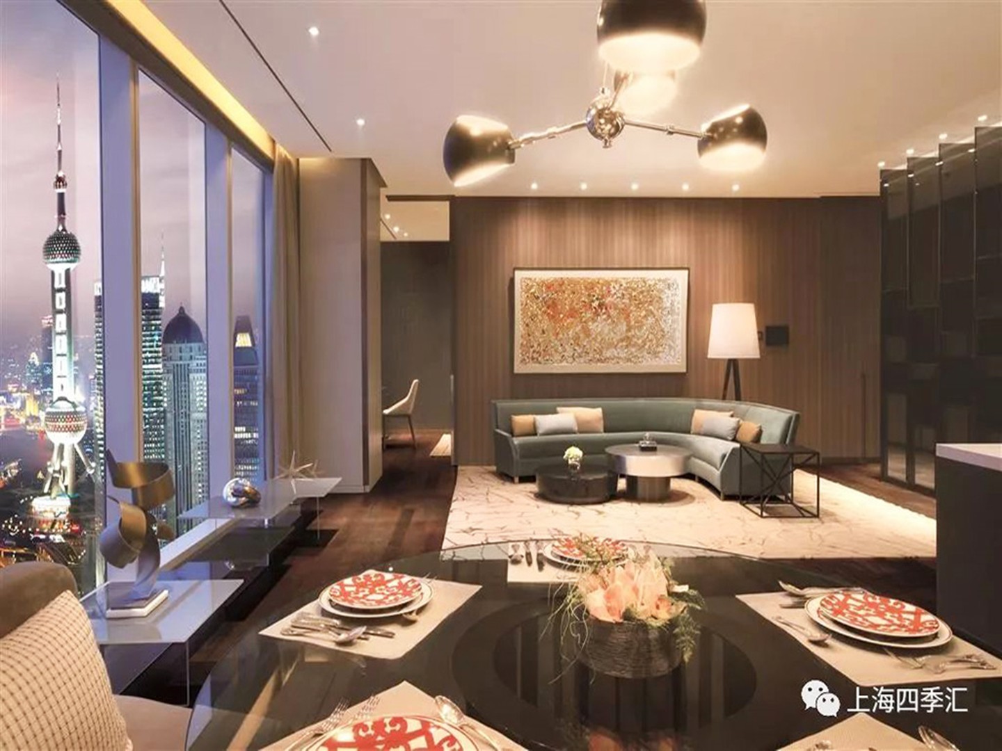 “四季匯”居所大氣奢華令人震撼。居所的設計與大堂一脈相承,進口珍稀的石材、木飾隨處可見,展現出低調洗練後的優雅高貴。大麵積的落地玻璃帶入充足光線,完美地將陸家嘴一天、四季的變化風景融入日常起居生活。