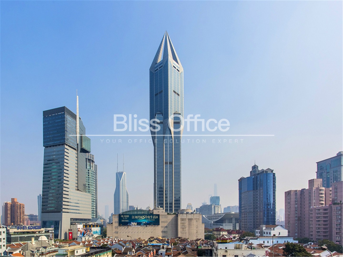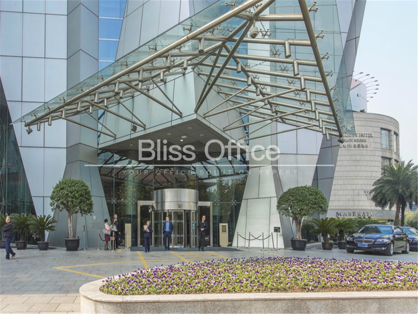 建築設計:由世界著名設計師事務所約翰波特曼設計,大樓線條硬朗明快,外型十分前衛,就像太空時代的巨型火箭。雄偉的大樓主要分為兩部分,下部是用作辦公樓,外型較複雜多變。上部四方立麵的位置是旅館部分,外觀簡約平實,使大樓形造強列的對比效果,卻又協調和諧。尖頂樓塔是整個建築物的焦點,由四枝三角支柱組成,中空的部分下有一個巨型的圓球,雄奇無比,在市區裏各處均可望見塔樓獨特的峰頂。